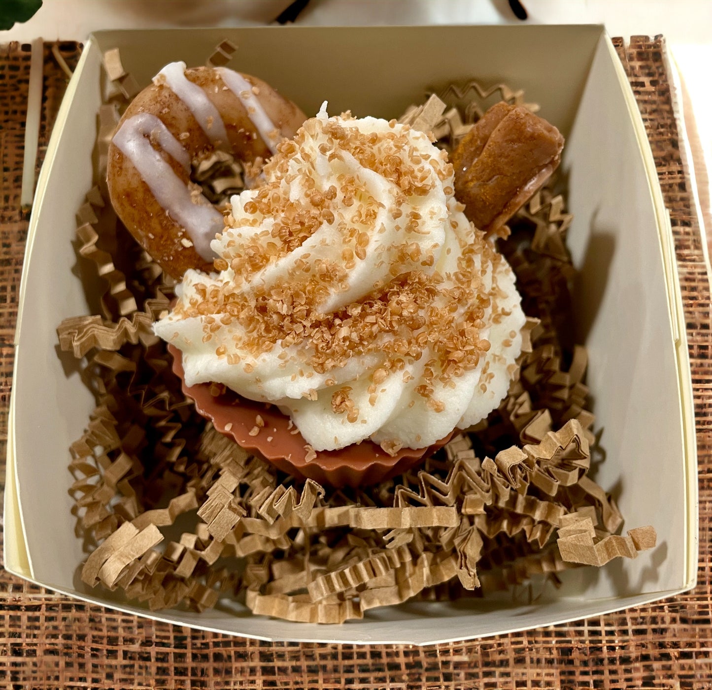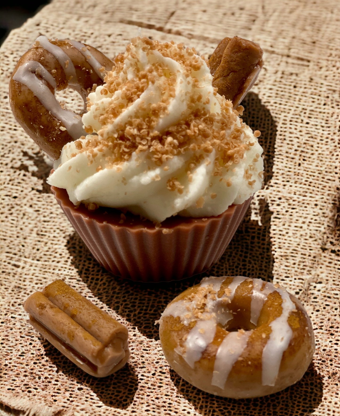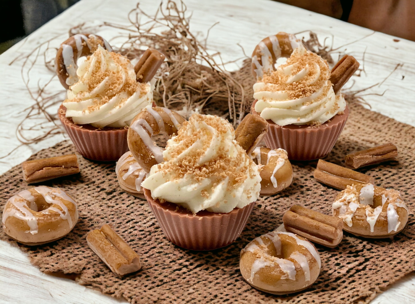 These Wax Melts are Scented in the Fragrance: "Apple Cider Donut". Each Cupcake is accented with a Wax Drizzled Donut and a Wax Cinnamon Stick.