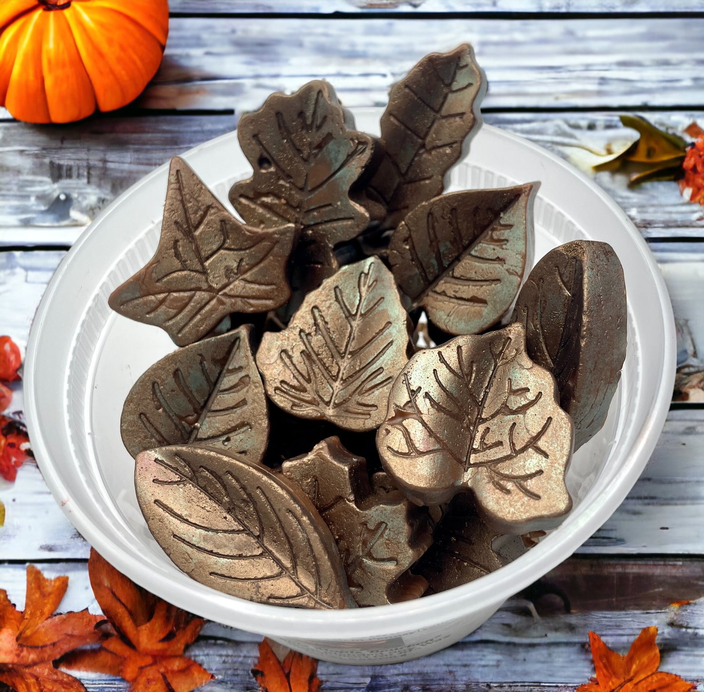 These leaf shaped wax melts are scented in the fragrance: "Apple Maple Bourbon". Each leaf is accented with a beautiful shimmer and metallic effect to add a touch of sparkle both in look and when melting.