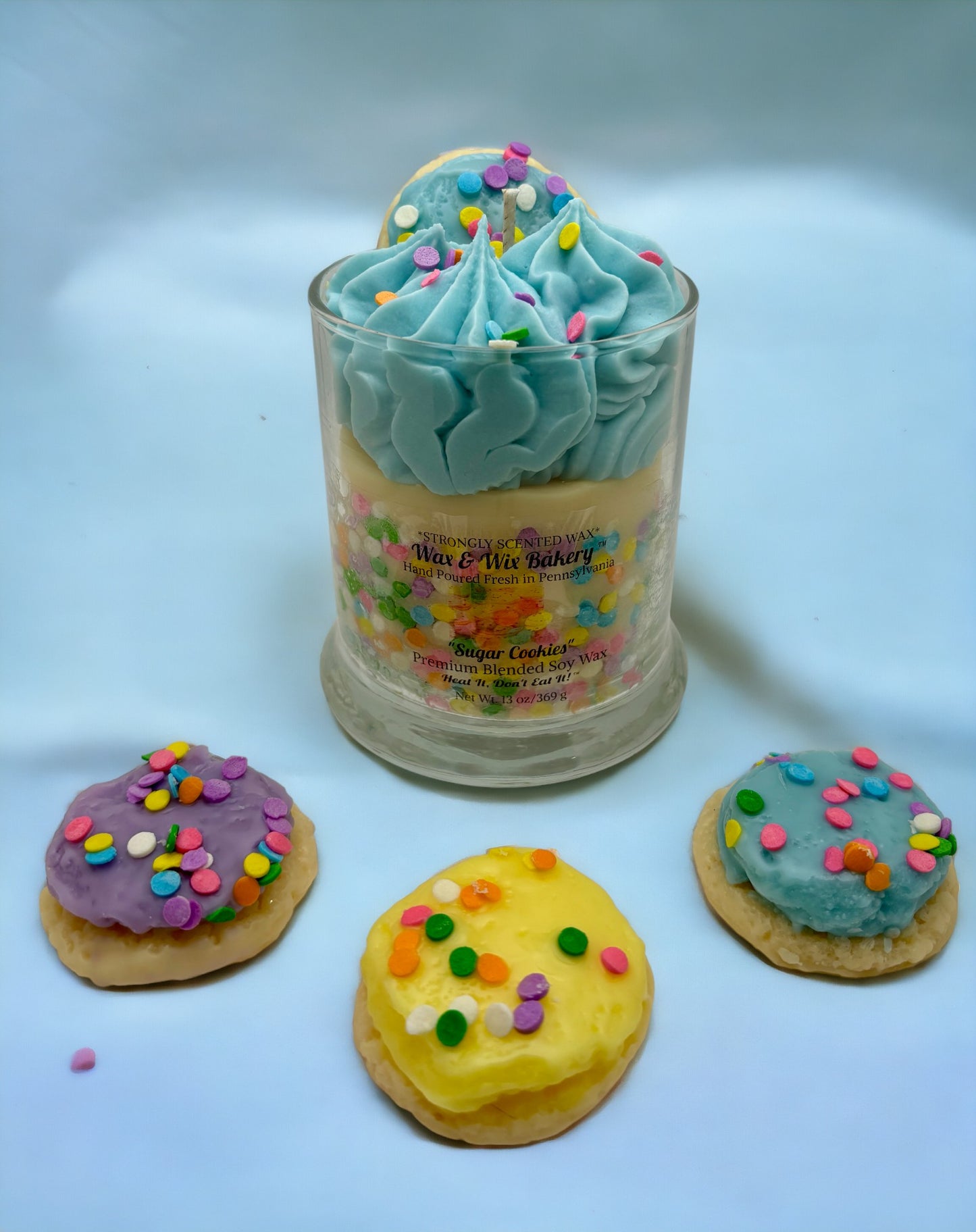These Frosted Sugar Cookie Soy Wax Candles are Scented in the Fragrance: "Sugar Cookies". They are Made of Blended Soy Wax. Each Candle has a Matching, Decadent Colored Frosted Whipped Topping. The top of each Candle is Accented with a Color-Matching Frosted Sugar Cookie and Confetti Sprinkles.