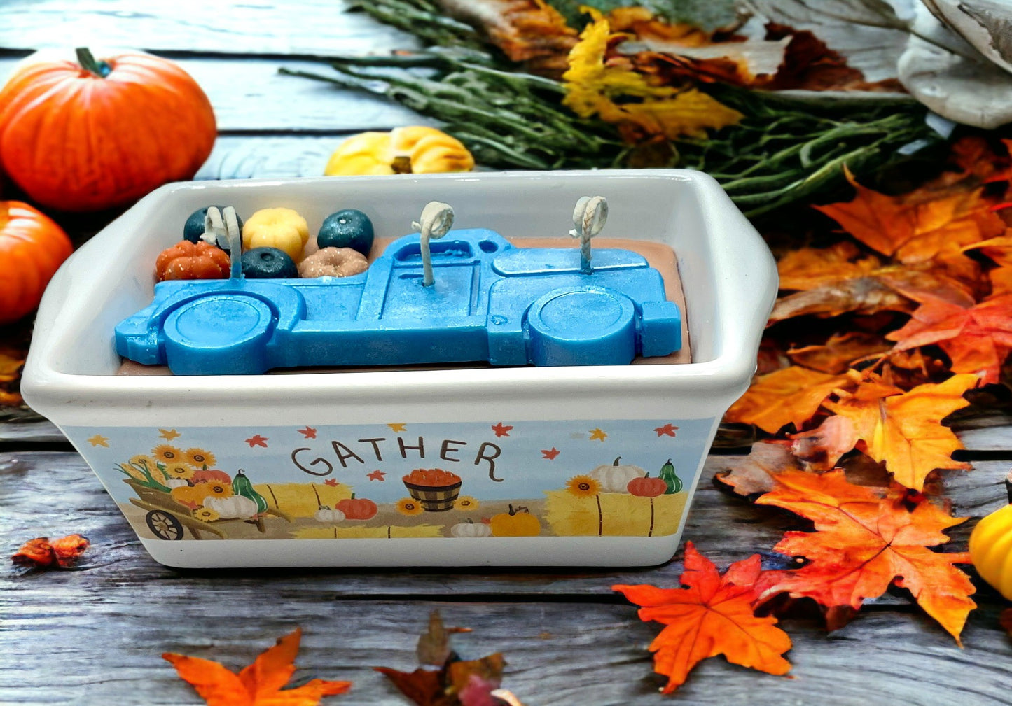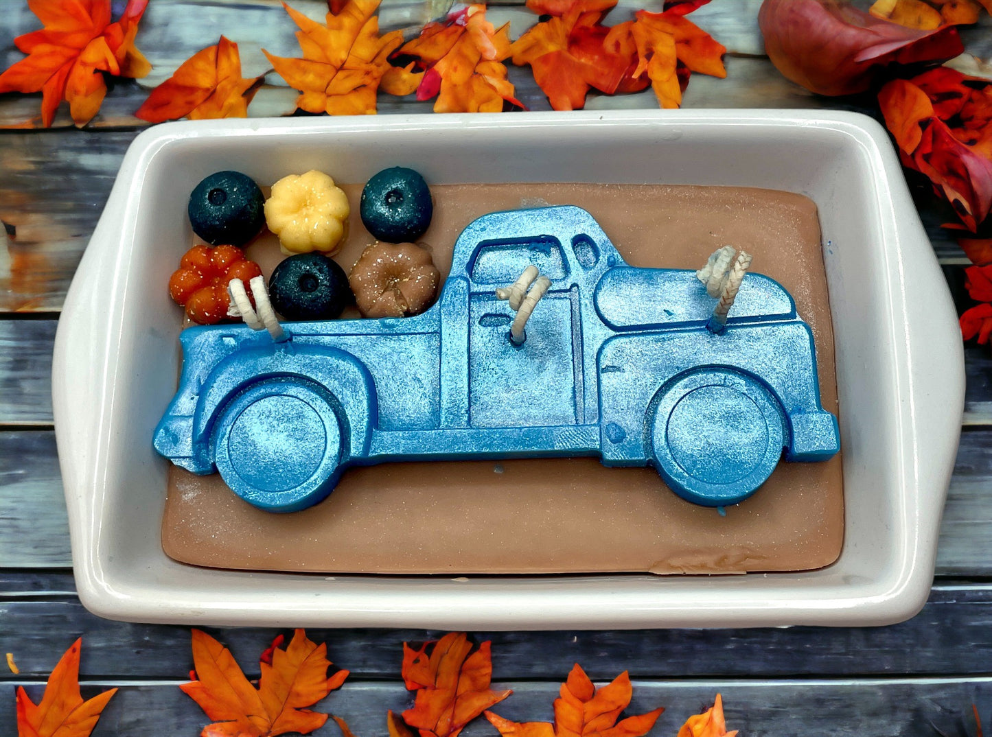 This Blue Truck with Pumpkins Candle is scented in the fragrance: "Blueberry Pumpkin Patch". It is triple wicked for maximum scent throw and even burning. The blue truck and pumpkins are accented with shimmer and sparkle for a beautiful look while burning.