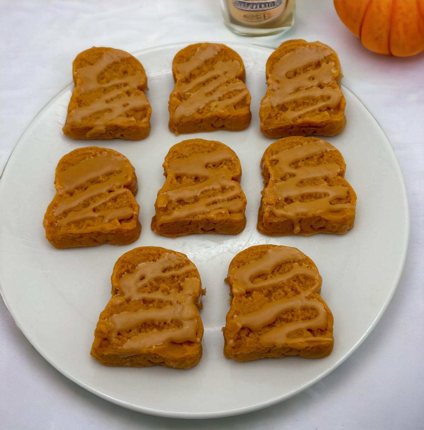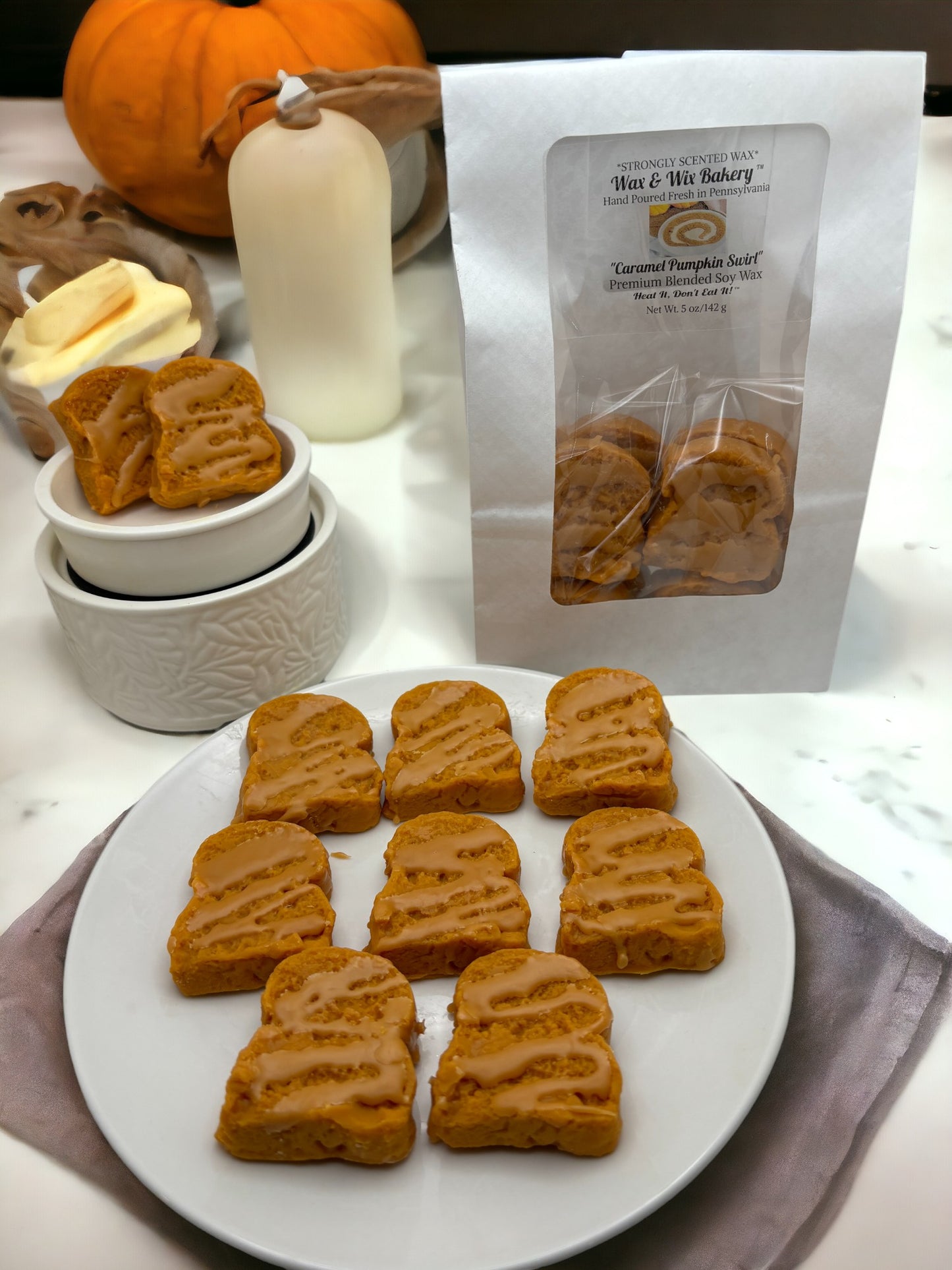 These wax melts are scented in the fragrance: "Caramel Pumpkin Swirl". Each piece is accented with caramel drizzle.