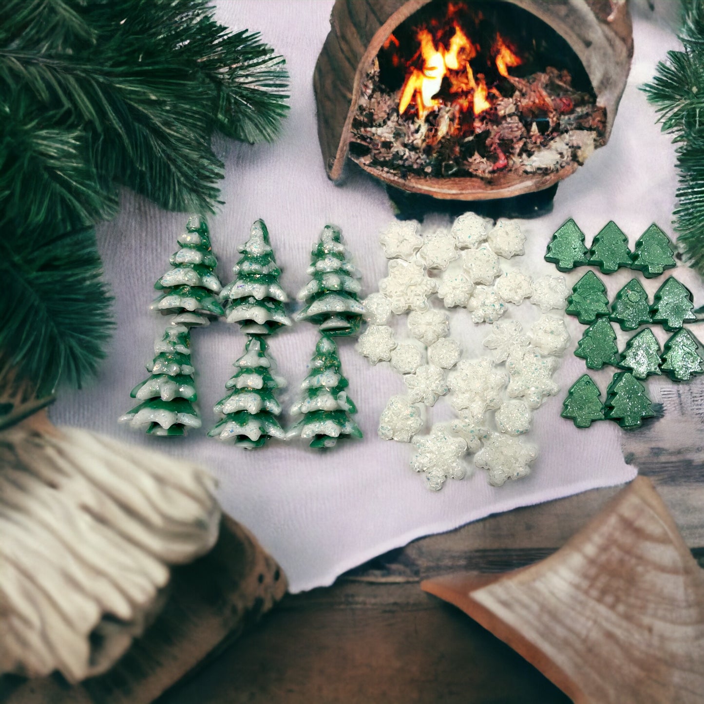 These Christmas Tree and Snowflake shaped wax melts are scented in the fragrance: "Christmas Tree Farm". Each piece is accented with a beautiful shimmer and metallic effect to add a touch of sparkle both in look and when melting.