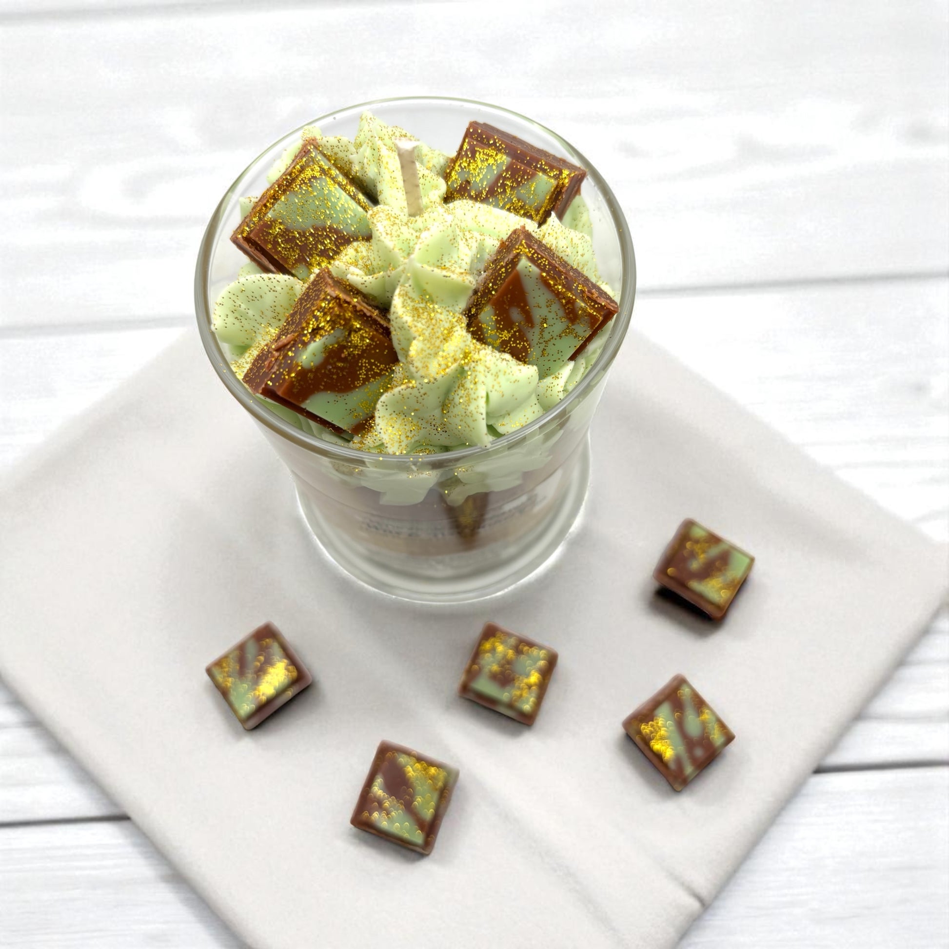 This Gorgeous Dubai Chocolate Luxury Soy Candle is scented in the fragrance: "Dubai Chocolate". This Beautiful layered candle has a Marbled Base in the colors of White, Mint Green and Brown with Gold Food Safe Glitter Accents around the Jar. It is topped with Mint Green Whipped Wax and adorned with 4 Gold Glittered Chocolate Pieces and Finished with a Beautiful Gold Dusting.