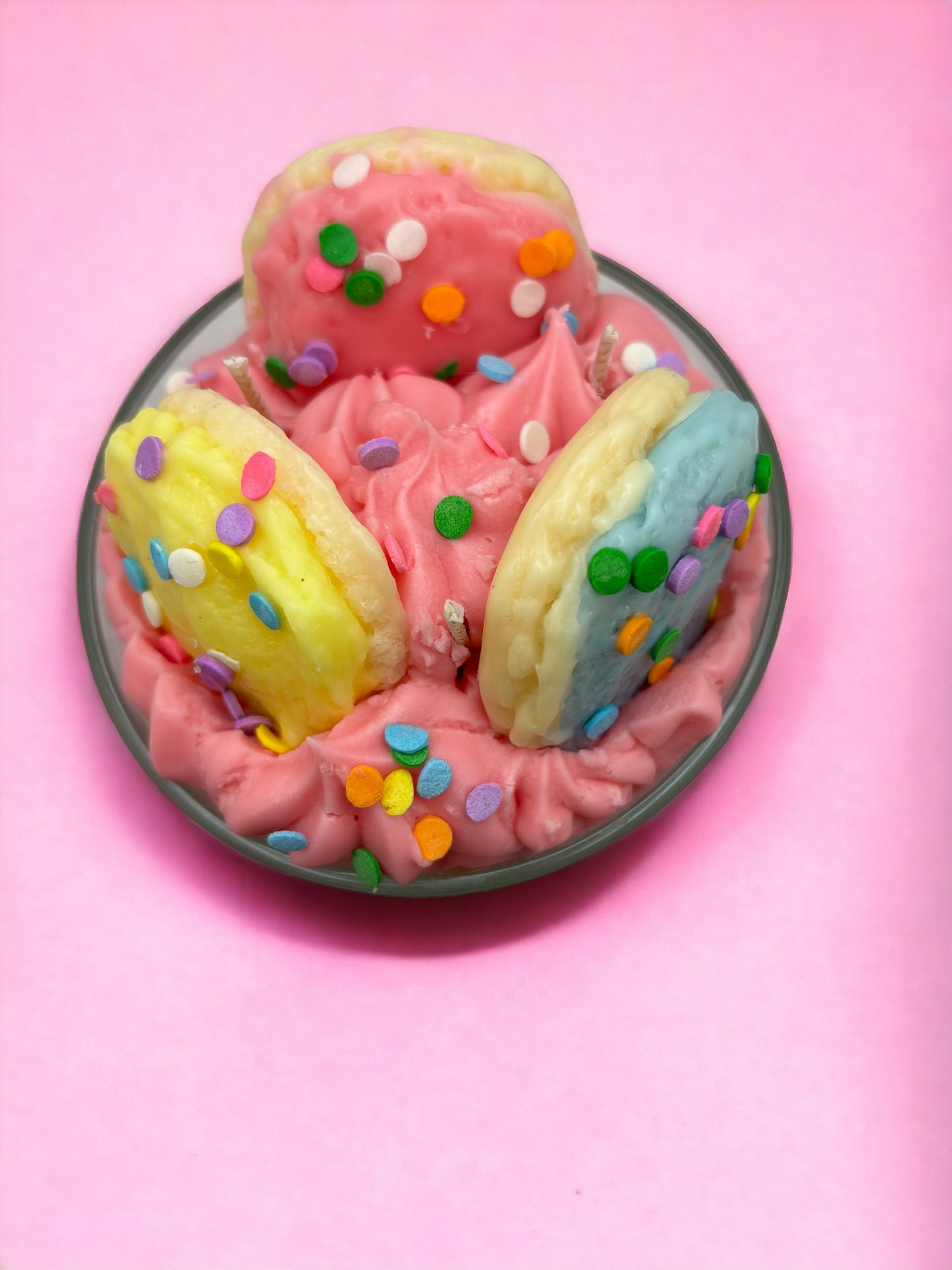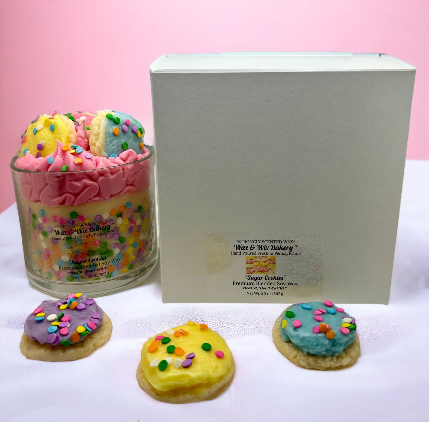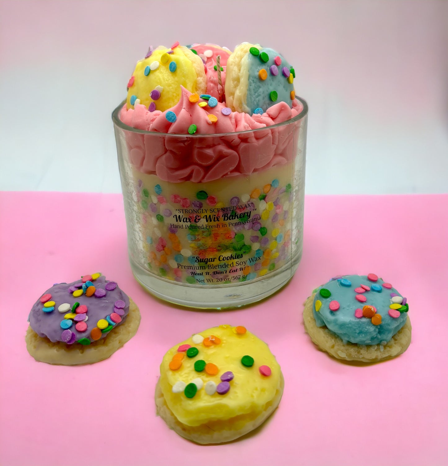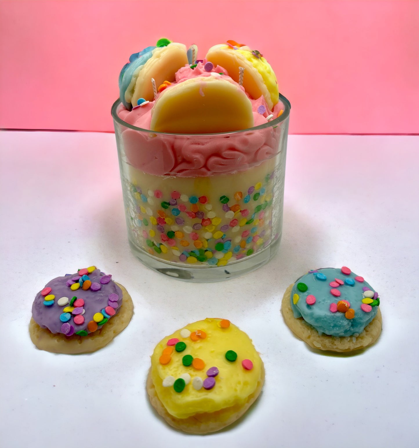 This Frosted Sugar Cookie Soy Wax Candle is Scented in the Fragrance: "Sugar Cookies". It is Made of Blended Soy Wax. Each Candle has a Matching, Decadent Colored Frosted Whipped Topping. The top of each Candle is Accented with 3 Color-Matching Frosted Sugar Cookies and Confetti Sprinkles.