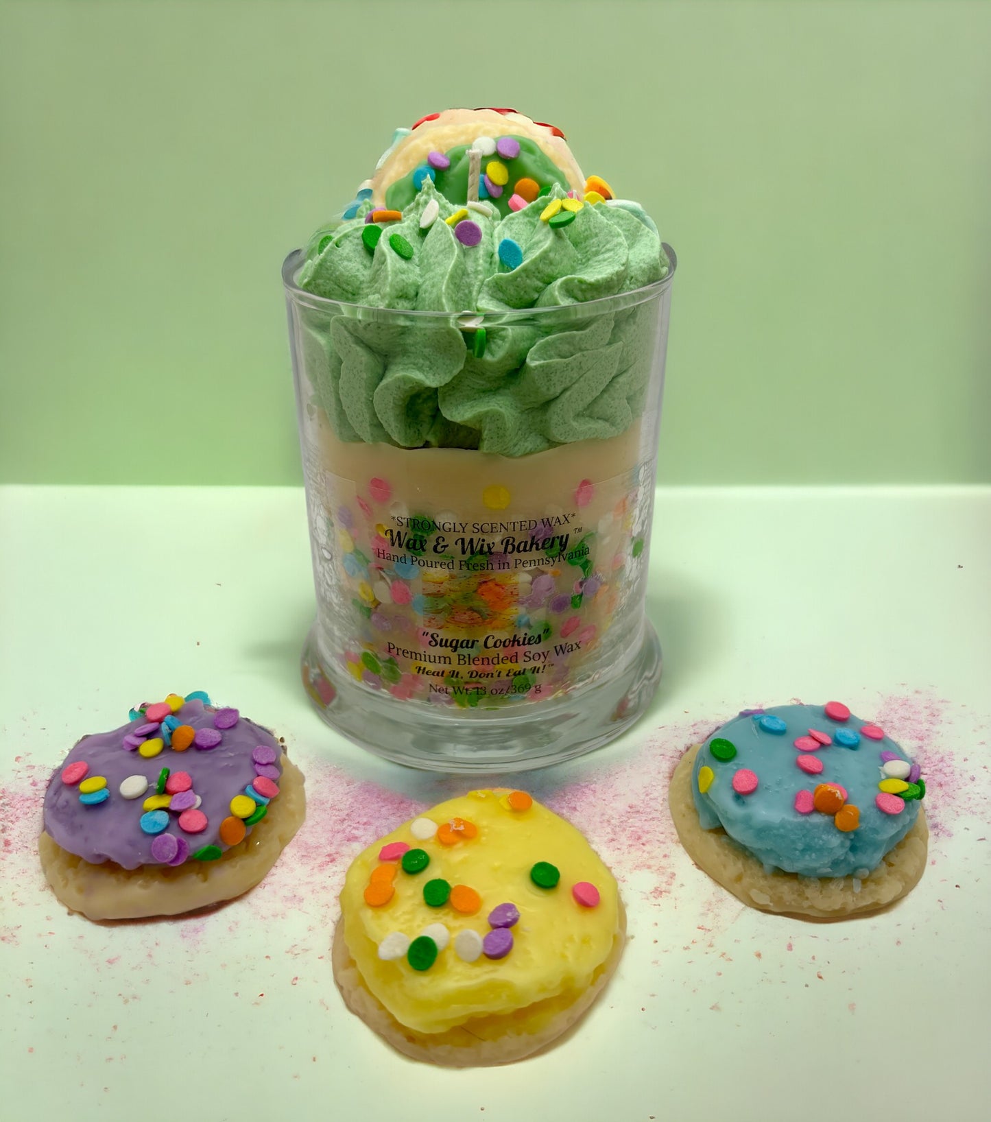 These Frosted Sugar Cookie Soy Wax Candles are Scented in the Fragrance: "Sugar Cookies". They are Made of Blended Soy Wax. Each Candle has a Matching, Decadent Colored Frosted Whipped Topping. The top of each Candle is Accented with a Color-Matching Frosted Sugar Cookie and Confetti Sprinkles.