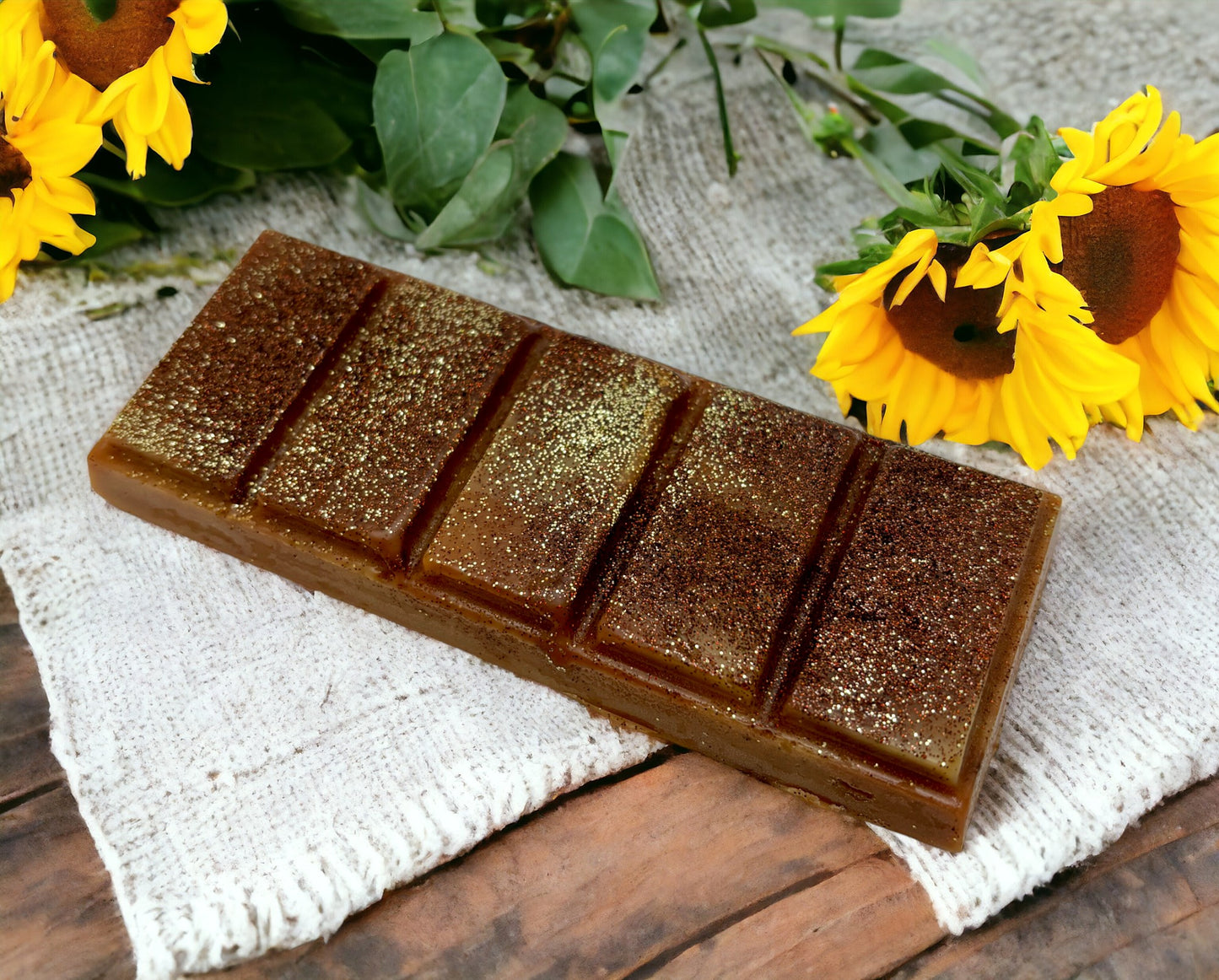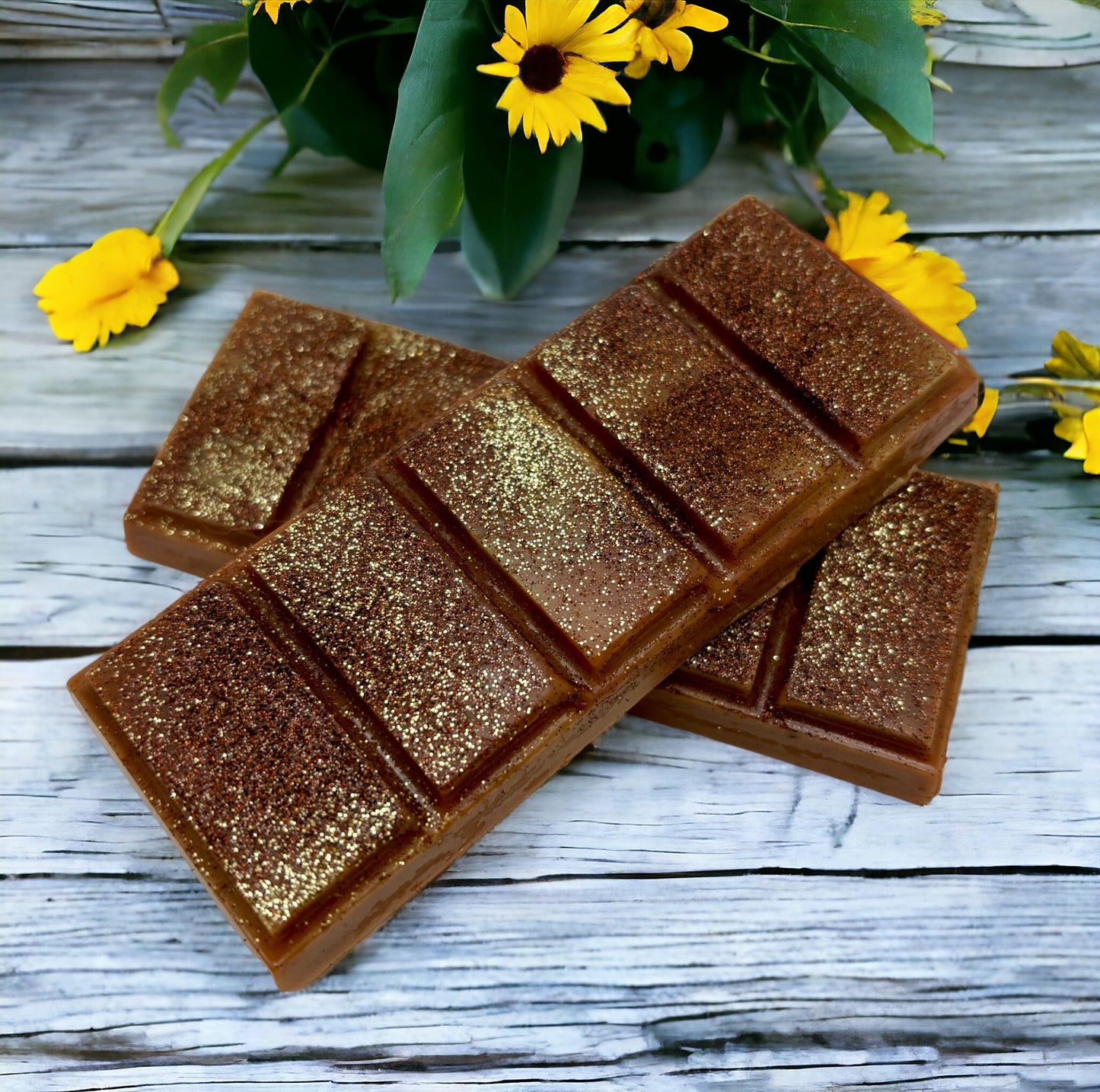 These wax melt snap bars are scented in the fragrance: "Honey Bunny". It is Marbled with Tan and Brown Wax and topped with Biodegradable Eco Glitter for a Beautiful look while burning. Simply discard with the wax when finished with use.