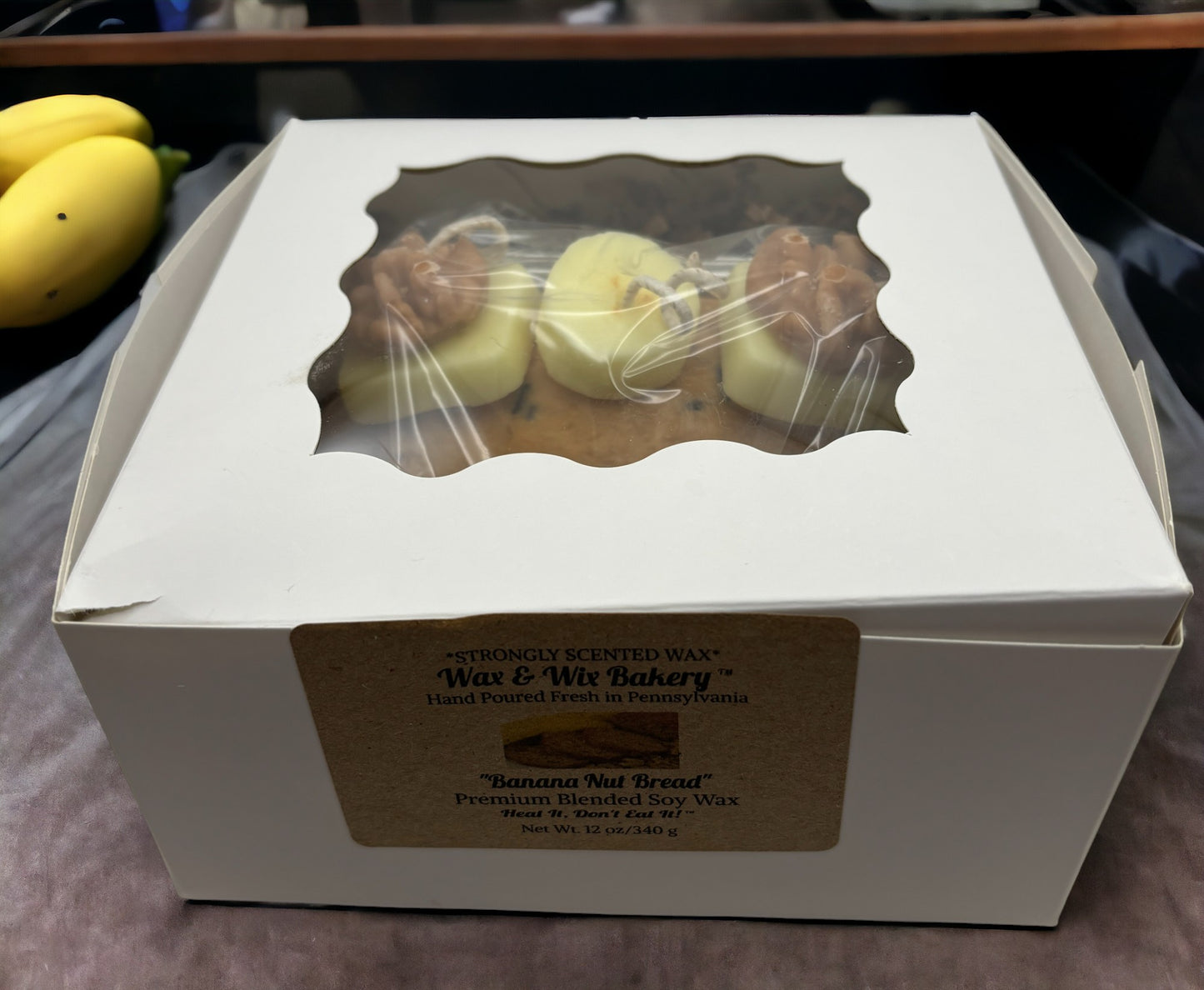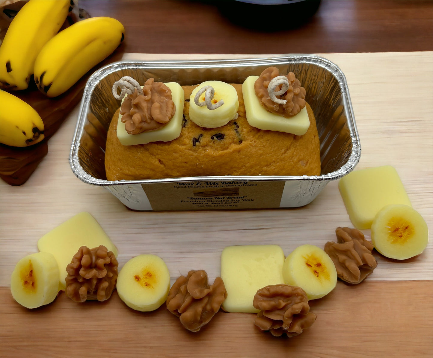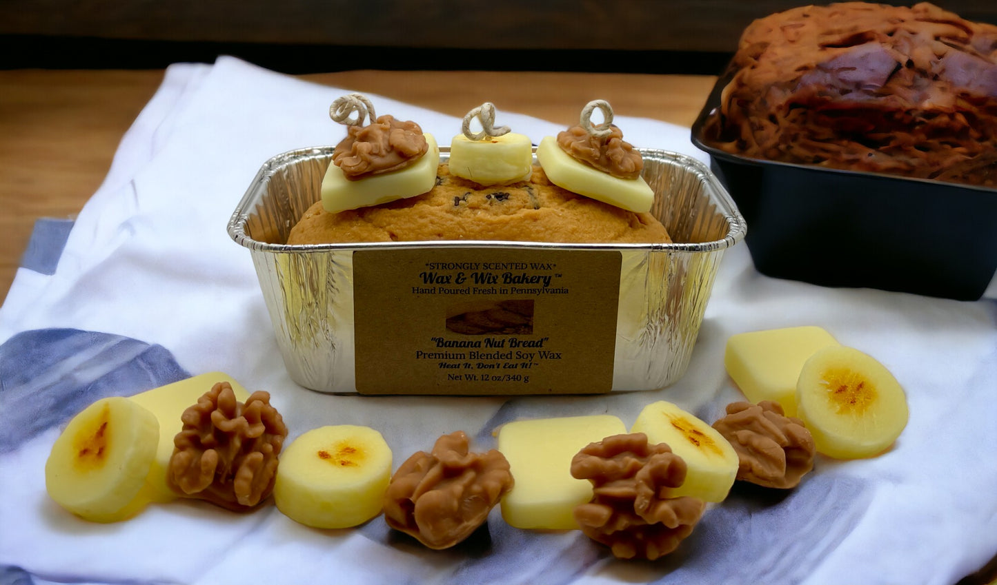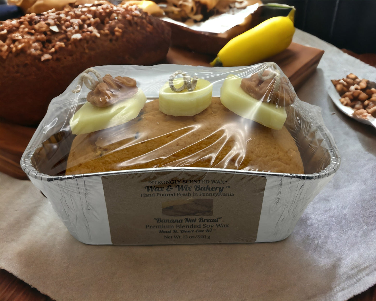 This Large 3 Wick Banana Bread Loaf Pan Candle is scented in the fragrance: "Banana Nut Bread". The Wicks and Top of Bread are topped with Banana Slices and Walnuts. These are not secured to the bread itself. Simply straighten and cut the wicks per candle card instructions and light and the toppings will burn with the candle. You may also remove the toppings and burn them separately in your electric wax melter if you desire.