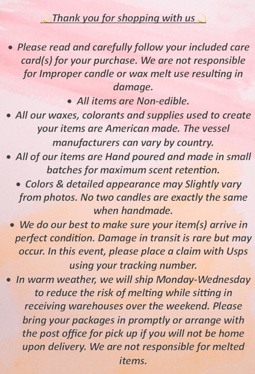 Please carefully follow the provided care & instruction card with each order. All items are Non-Edible. All items are hand poured and made in small batches for maximum scent retention. Colors & detailed appearance may vary Slightly from photos. No two items are exactly the same when handmade. Please make sure you Promptly bring delivered items inside as we are Not responsible for melted, etc. items.