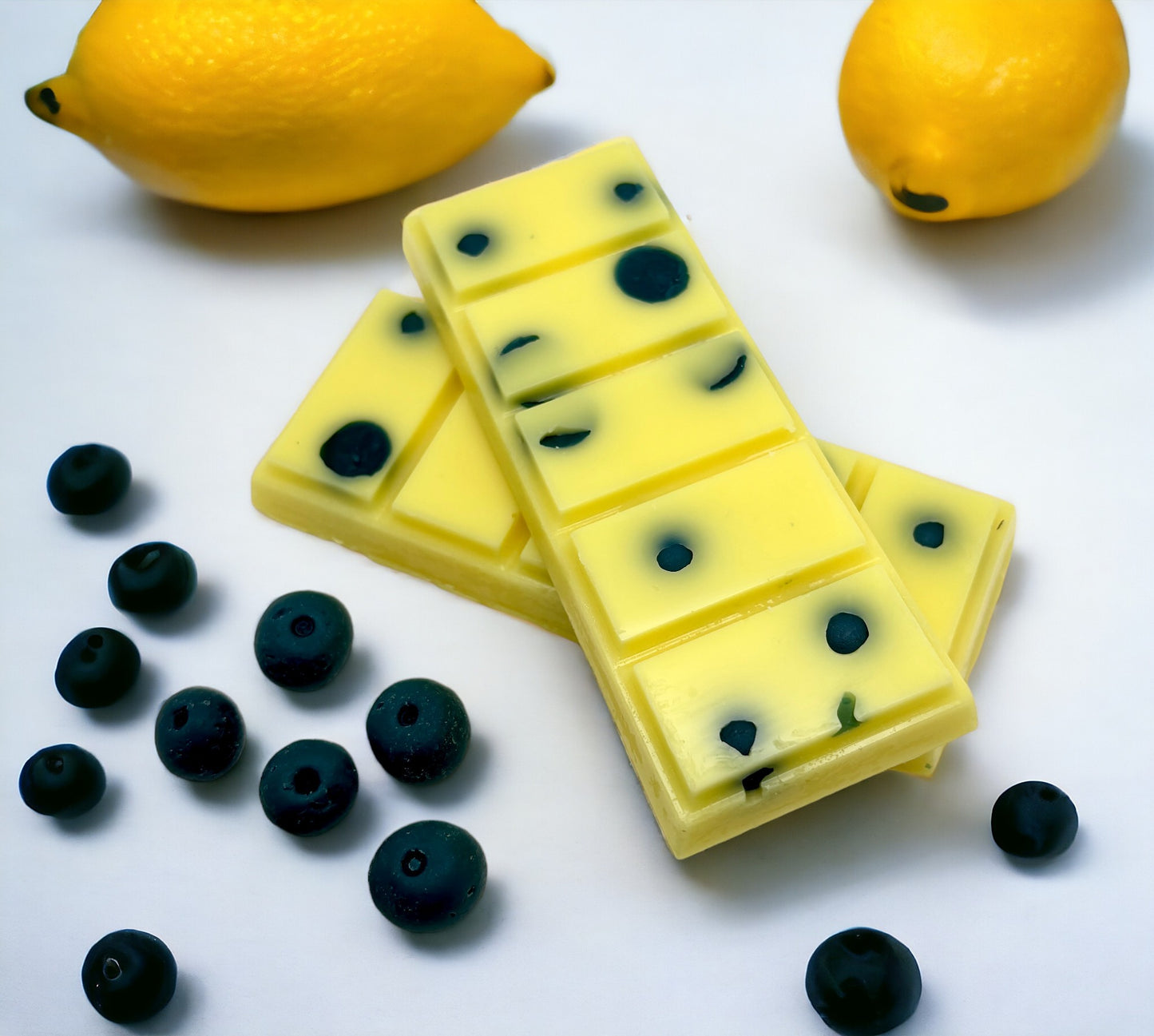 These wax melts/snap bars are scented in the fragrance: "Lemon Blueberry Pound Cake". Each wax melt/snap bar is adorned with Blueberry Wax Melts.