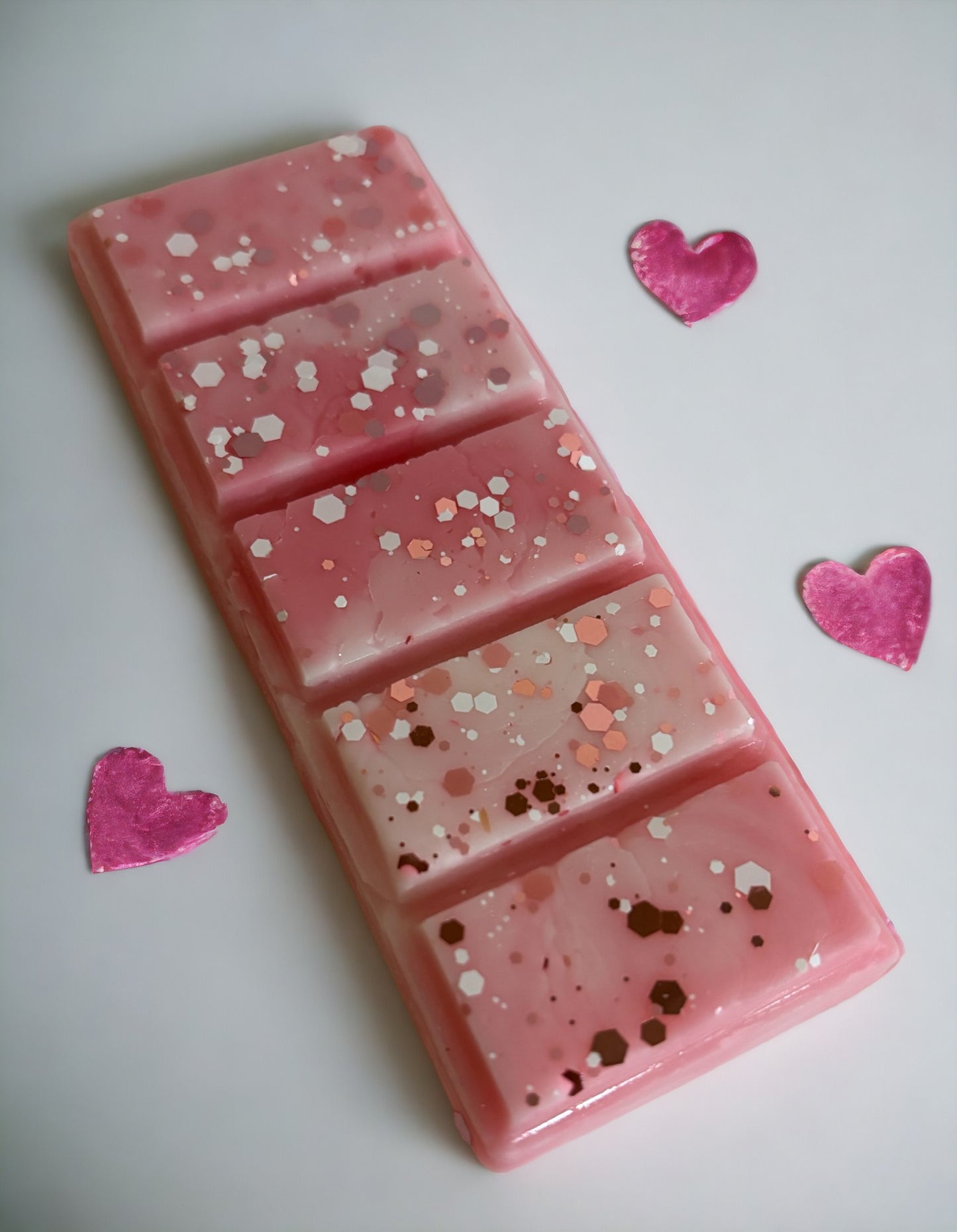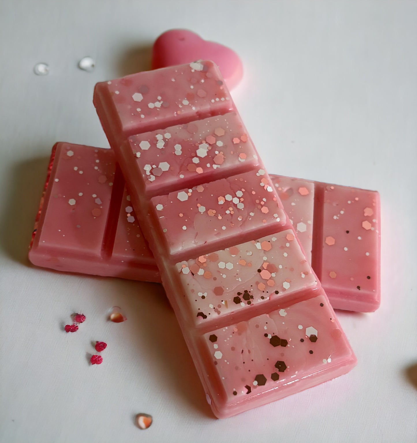 These wax melts, wax tarts, snap bars are scented in the fragrance: "Love Spell". Each bar has accent eco safe glitter that is safe for use. They will not melt and provide a nice look mixed within the melted wax. Simply discard with the wax when finished with use.