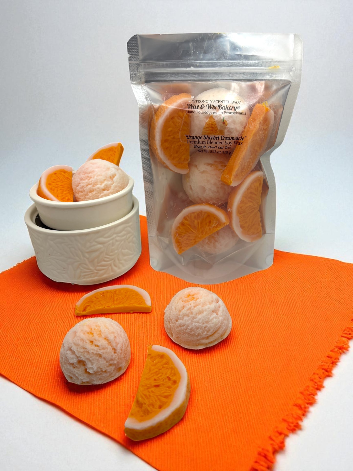 These wax melts are scented in the fragrance: "Orange Sherbet Creamsicle"