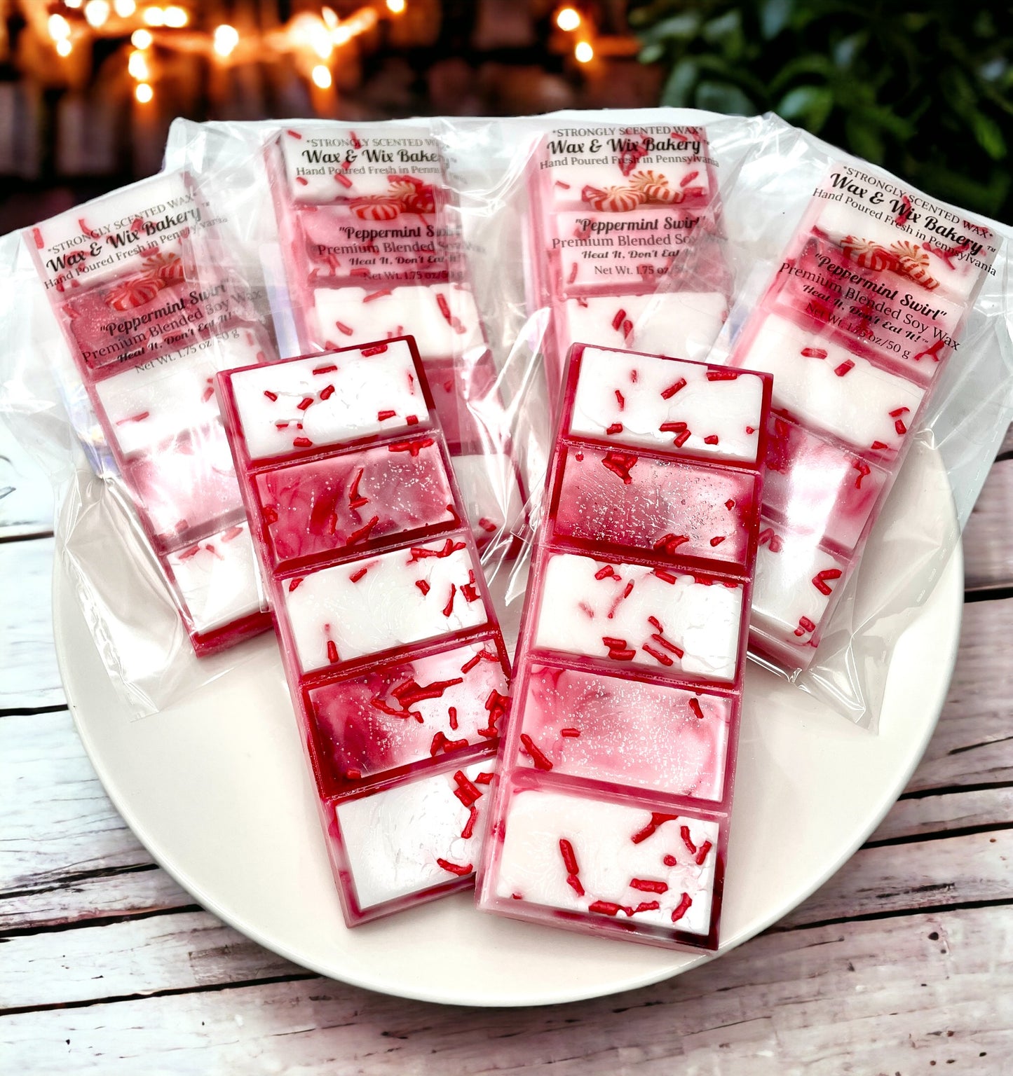 These wax melts, wax tarts, snap bars are scented in the fragrance: "Peppermint Swirl". Each bar has accent red sprinkles that are safe for use. The candy pieces will not melt and provide a nice look mixed within the melted wax. Simply discard with the wax when finished with use.