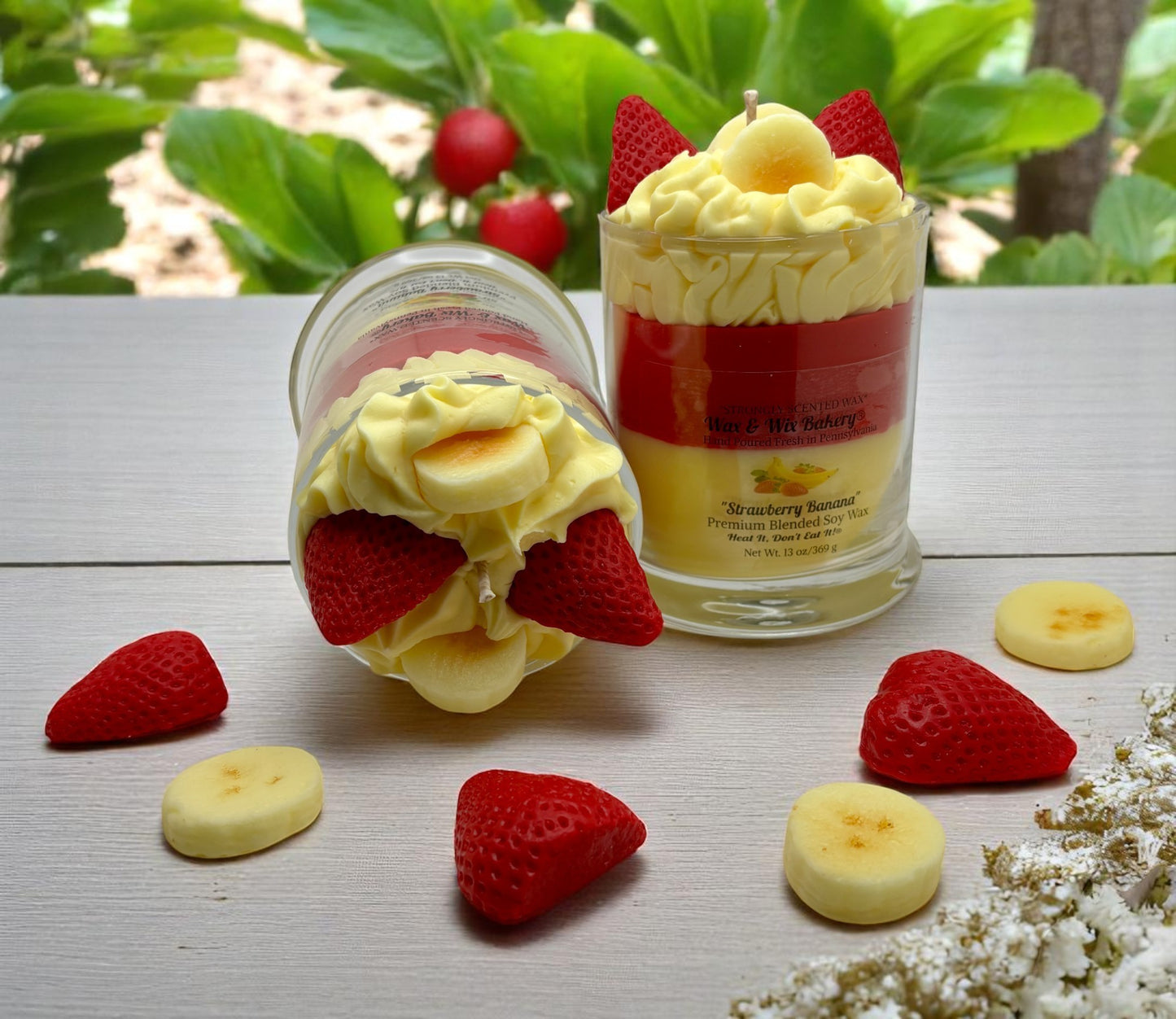 This Strawberry Banana Candle is scented in the fragrance: "Strawberry Banana". This Beautiful Layered Candle has a Yellow Base with a Red Layer Atop. It is Finished with White Whipped Wax and Adorned with 2 Strawberry Half Wax Melts, 2 Banana Slice Wax Melts.