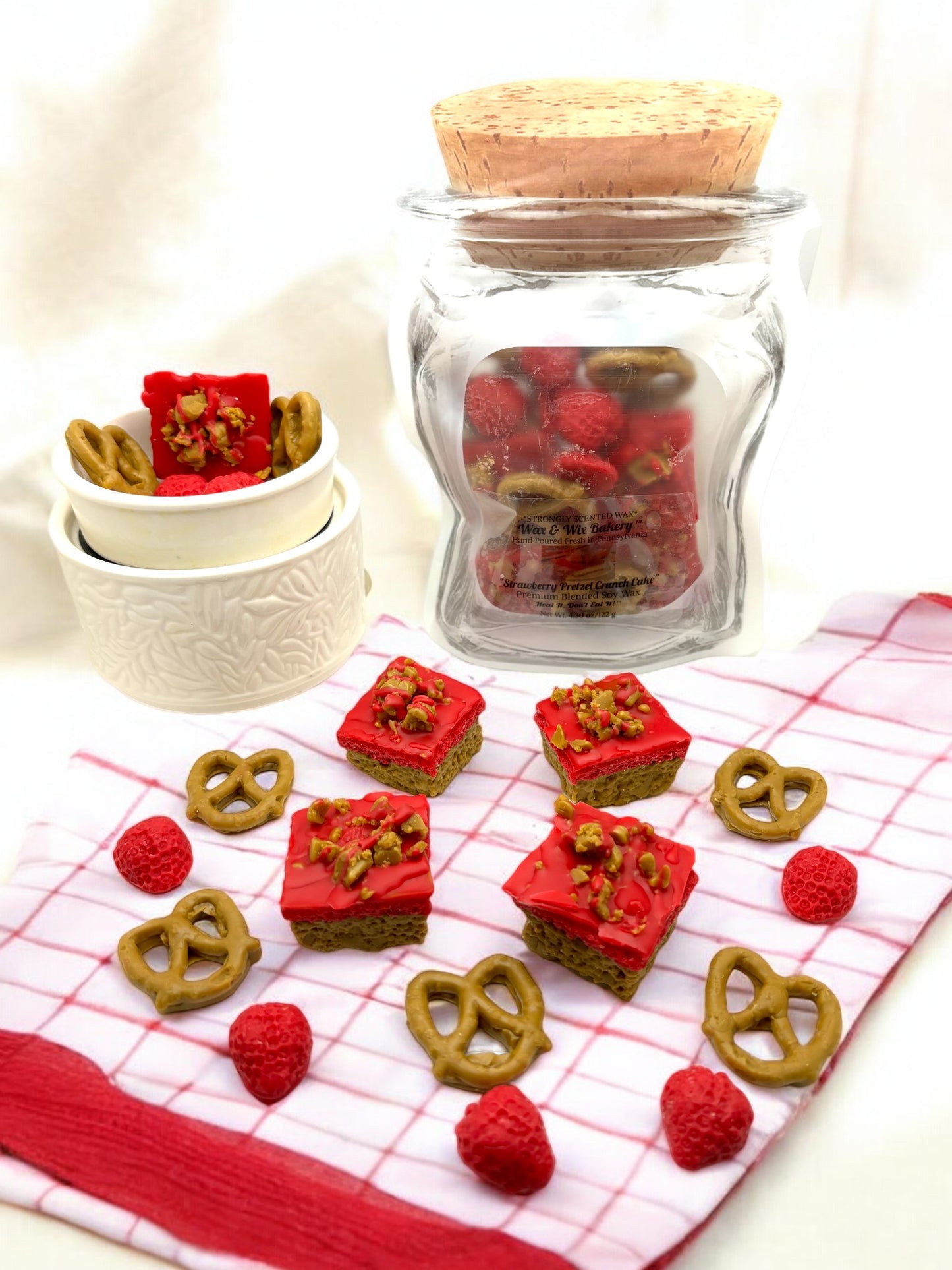 Strawberry Pretzel Crunch Wax Melts. Bakery Wax Melt. Soy Wax Melts. Strongly Scented Wax Melts/Wax Tarts for Wax Warmers. 4.30 oz. 4 Cake Realistic Pretzel Crunch Cake Squares Wax Melts, 5 Mini Strawberries and 5 Mini Pretzels.